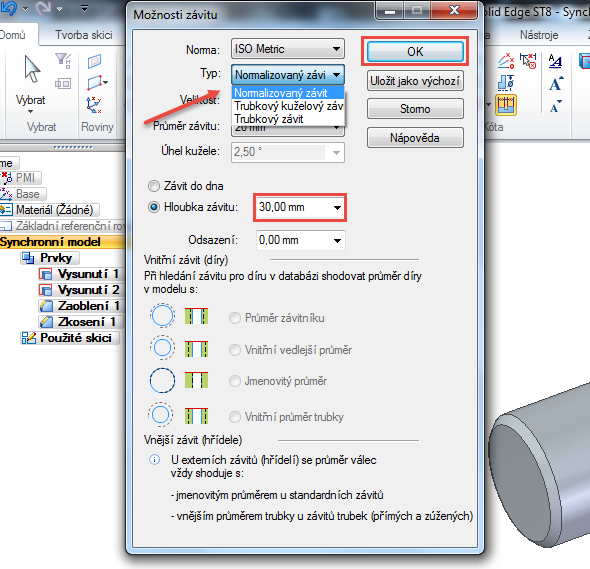 Vnější závit lze vytvářet na válcových či kuželových plochách. Řešení Solid Edge podporuje tvorbu tří typů závitů – normalizovaného, trubkového a trubkového-kuželového. V tomto návodu si ukážeme, jak vytvořit vnější závit na válcové ploše.