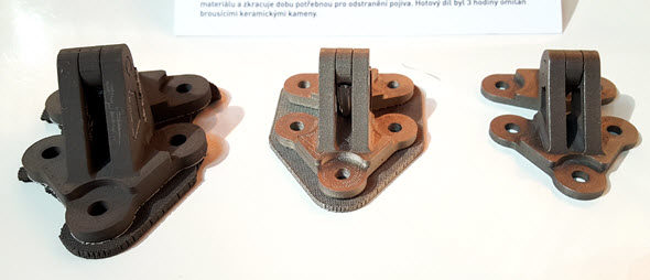Třetí etapa: Po spékání následuje odstranění podpor a postprocesní úpravy. Spodní část dílu byla obrobena, aby byla vidět nízká hustota výplně. Pokud uvažuje konstruktér nad dobou tisku, která ovlivňuje i cenu výroby, doporučuje se navrhovat řídkou vnitřní strukturu. Tato konstrukční úprava současně snižuje spotřebu materiálu a zkracuje dobu potřebnou pro odstranění pojiva. Z důvodu kvalitativních požadavků na povrch prototypu následovalo omílání brousícími keramickými kameny 3 hodiny.
