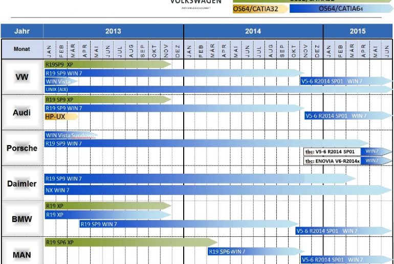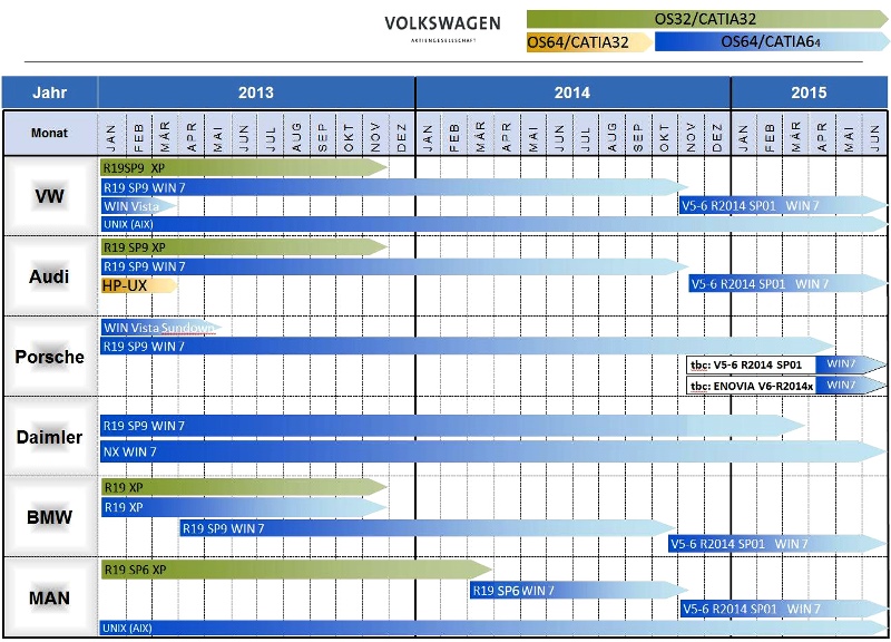 Podle informací ze zpravodaje společnosti Technodat, CAE-systémy, se v posledním čtvrtletí roku 2014 očekává přechod zejména německých OEM automobilek na poslední verzi systému Catia V5 s označením V5-6R2014. Migrace se dotkne koncernu Volkswagen včetně jeho dceřiných společností Škoda Auto, Audi, Porsche, Seat, Man i konkurenčních výrobců Daimler a BMW. Jan Cinert na webu Catia-forum.cz zmiňuje, že automobilka Porsche zároveň zavede systém Enovia V6-R2014x.
