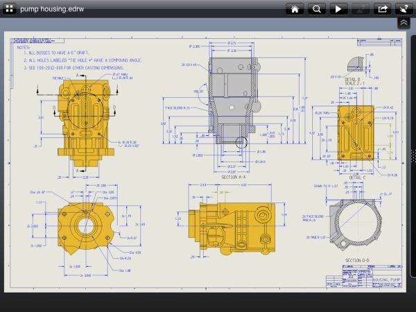 eDrawings® for iPad allows you to view and review native eDrawings® files, DraftSight® files, SolidWorks® parts, assemblies and drawings files, making it easy for engineers and non-engineers to interpret and understand 2D and 3D design using multi-touch gestures.