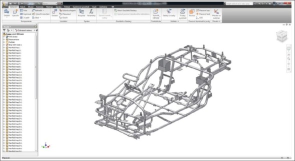 Pro vytvoření téměř identického modelu rámu buggy bylo nutné ještě převést plošné těleso na objemové. Objemové těleso bylo vytvořeno postupným přiřazováním určité tloušťky jednotlivým primitivním plochám, pak následovala úprava napojení na sebe navazujících ploch. Pro další zpracování technologického postupu montáže se převedl model součásti z programu Catia do softwaru Inventor. Transport byl proveden pomocí univerzálního datového formátu STEP, který je kompatibilní s oběma programy. Model spodního rámu a následné modelování ostatních dílů bylo provedeno v softwaru Inventor z toho důvodu, že umožňuje zjednodušenou tvorbu „rozbitých“ pohledů sestav, nutných pro vytvoření montážních výkresů.