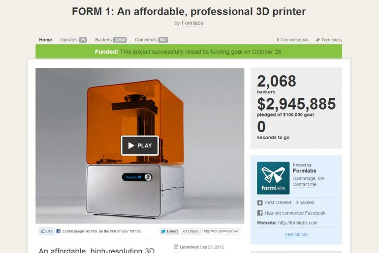 Projekt „domácí“ 3D tiskárny Form 1 byl jedním z největších úspěchů, jakých kdy kdo dosáhnul na webu Kickstarter, což je platforma pro drobné investory (tedy i pro každého z nás), kteří se chtějí podílet na podpoře zajímavých inovací.
