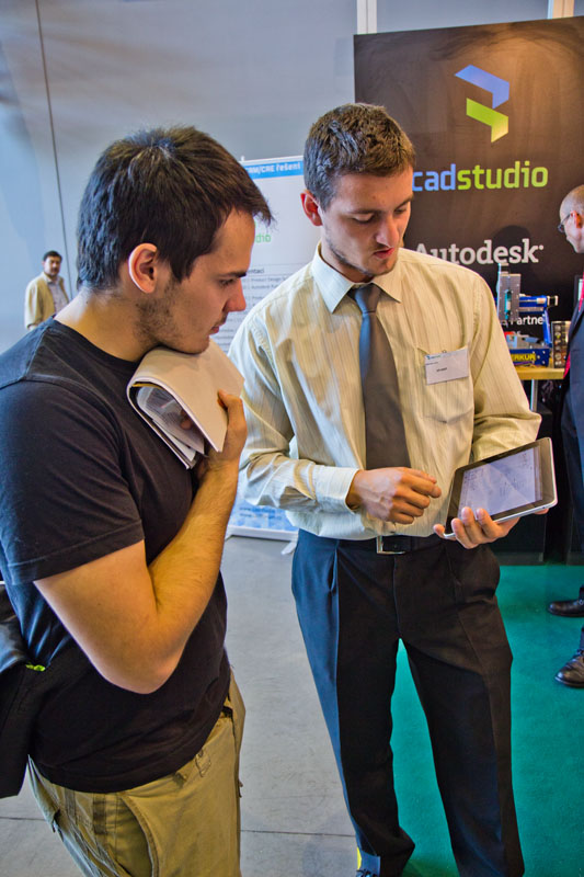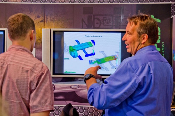 Procházku po pavilonu P, který je i letos centrem pro každého, koho zajímá CAD, CAM a technologie pro podporu výroby ve strojírenství, začínáme neskromně u stánku našeho vydavatelství (P 004). Oproti loňsku se naše expozice rozrostla nejen plochou, ale především spektrem nabízených titulů. Časopis CAXMIX, věnovaný CAD a CAM softwaru, který je určen zejména pro jeho uživatele, od letoška doplňuje magazín PLM News, připravovaný s ohledem na čtenáře z řad manažerů průmyslových firem, kteří se poohlížejí po softwarových nástrojích, jež by jim pomohly zefektivnit výrobní procesy i související procedury. Krom originálních českých článků jsou součástí PLM News vždy i nezávislé studie od renomované mezinárodní organizace CIMdata, která se věnuje recenzování, analýzám a vyhodnocování vlastností a přínosů PLM systémů a PDM softwaru.Naše sympatické a usměvavé hostesky každému návštěvníkovi našeho stánku, který na základě vyplnění informačního formuláře projeví seriózní zájem o CAD/CAM software, nabídnou zcela zdarma půlroční předplatné časopisu CAXMIX na zkoušku. Těší nás nejen rostoucí zájem o časopis z řad nových čtenářů, ale i skutečnost, že mnozí našemu časopisu fandí natolik, že si přímo a sami od sebe řeknou nikoliv o bezplatné, nýbrž standardní předplatné za úhradu v zájmu podpořit činnost, kterou zde vyvíjíme. Velmi často nastává také situace, kdy se na nás návštěvníci stánku obrací s konkrétními dotazy a prosbami o radu při výběru vhodného CAD řešení nebo souvisejících aplikací. Tyto obvykle okamžitě odkazujeme k expozicím vhodných dodavatelů, kteří jsou schopni poskytnout fundované informace a nabídnout odpovídající produkt.V našem těsném sousedství, při východním vstupu do pavilonu P, narazíte na rozlehlý stánek pod patronátem společnosti Autodesk, sdružující české prodejce jeho řešení pro strojírenství. Firmy CAD Studio, Adeon CZ, AW Graph a SmartPlast najdete pohromadě pod číslem P012.Ať do „péčka“ dorazíte z kterékoliv strany, zajímají-li vás novinky v softwarech od Autodesku, jako jsou například cenově výhodné produktové balíčky, alias Design Suites, anebo jen chcete pozdravit staré známé, tuto expozici najdete velmi snadno díky obří LCD obrazovce zavěšené pod stropem pavilonu.Na expozici firmy AW Graph uvidíte při práci produktového designéra a vizuálně velmi atraktivní hardware i software. Kombinace dotykového LCD tabletu Wacom s grafickým softwarem Alias Studio na návštěvníky funguje jako magnet.Podobně lákavé je v poslední době cokoliv s logem nakousnutého jablka, uživatele CAD systémů nevyjímaje. Nakousané ovoce sice na expozici Autodesku a jeho partnerů velmi pravděpodobně nenajdete (zato určitě ochutnejte některý ze skvělých drinků z jejich vtipného menu), ale můžete se seznámit s „jablečným“ iPadem, pro který Autodesk zpřístupnil už několik šikovných programů, jež se dají ovládat prsty.Ředitel místní pobočky společnosti David Palas nám zapózoval s energetickým nápojem značky, kterou zde není třeba dlouze představovat. Co si však představení zaslouží, je nová služba Autodesk Cloud, která zákazníkům Autodesku, kteří využívají předplacené služby Subscription, zpřístupňuje webové nástroje pro rychlé zpracování vizualizací a sdílení obrazových dat přes internet.Ještě jednou Autodesk a opět David Palas, v doprovodu Martina Peňáze, který má v místní divizi na starosti celou sekci strojírenství. Zatímco pánové jednají, monitory v jejich zádech symbolicky tiše prezentují všechny možné výhody tzv. digitálního prototypování. Pokud vám tento pojem nic neříká a přitom pracujete ve strojírenské konstrukci, máte o důvod víc, proč se zastavit právě tady, na stánku P012.InventorCAM, což je označení systému SolidCAM upraveného pro integraci do Autodesk Inventoru, je na českém trhu vnímán lehce kontroverzně a jeho cesta k oficiální podpoře ze strany Autodesku zde nebyla jednoduchá. Že se situace změnila, o tom svědčí i to, že prodejce InventorCAMu z firmy DTS-Praha často potkáte právě na expozici prodejců řešení značky Autodesk. Jediná cenzura, a to navíc v žertu zahraná, se dnes týká hostesky náhodně překryté logem zmiňovaného produktu. Na fotografii zleva: Lukáš Poukar (obchodní manažer) a Jan Brůžek (technický specialista) z DTS-Praha.Kdo se věnuje formařině, tomu zřejmě není neznámý název Moldflow, tedy software pro simulace vstřikovacích procesů. Aplikace již díky akvizici původního producenta spadá pod Autodesk a s ní v podstatě také česká firma SmartPlast, která zde Moldflow nabízí a podporuje. Ředitel společnosti Petr Halaška (vpravo) je každopádně velmi vstřícný člověk s bohatými zkušenostmi v oboru a v dané problematice vám rád poradí, ať už používáte Inventor nebo jiný CAD systém. Díky otevřenosti Moldflow je totiž velmi pravděpodobné, že tato aplikace spolupracuje možná i s vaším programem.