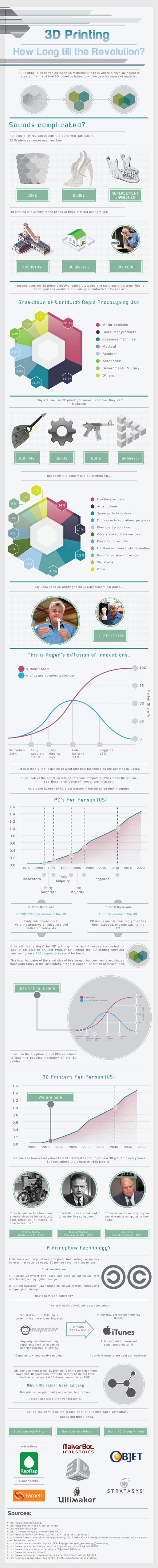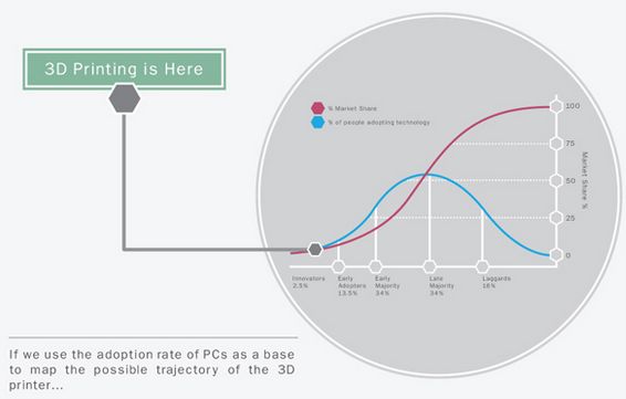 V infografice je takto situace 3D tiskáren prolnuta do grafu rozvoje osobních počítačů. Zatímco v roce 1975 připadalo na jednoho Američana 0,0002 PC, v roce 2010 byl poměr vyrovnán na 1:1. Přirovnáme-li k tomu 3D tiskárny, nacházíme se někde na počátku osmdesátých let minulého století, kdy počítače ještě většinou nebyly ani osobní, stály horentní sumy a v domácích podmínkách jejich „mikro“ verze používali jen ti nejzarytější nadšenci, pochopitelně matematici a programátoři. V takové pozici je k dnešku 3D tisk z pohledu domácích uživatelů.