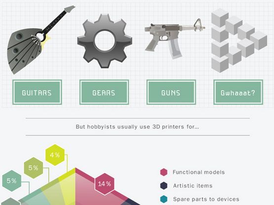 Autoři této vizuální „studie“ z webu Newark.com vysvětlují, k jakým účelům je v současnosti 3D tisk používán a kým. Dozvídáme se, že jsou zde dvě větve vývoje – pro průmysl a pro domácí kutily. V profesionální sféře zaujme, že se 3D tisku nejvíce využívá v průmyslu automobilovém (31,7 %), spotřebního zboží (18,4 %) a komerčních strojů (11,2 %). Následuje uplatnění ve zdravotní technice (8,8 %), v akademické sféře (8,6 %) a teprve až zde v leteckém průmyslu (8,2 %), následovaném vládami a armádami (7,7 %).