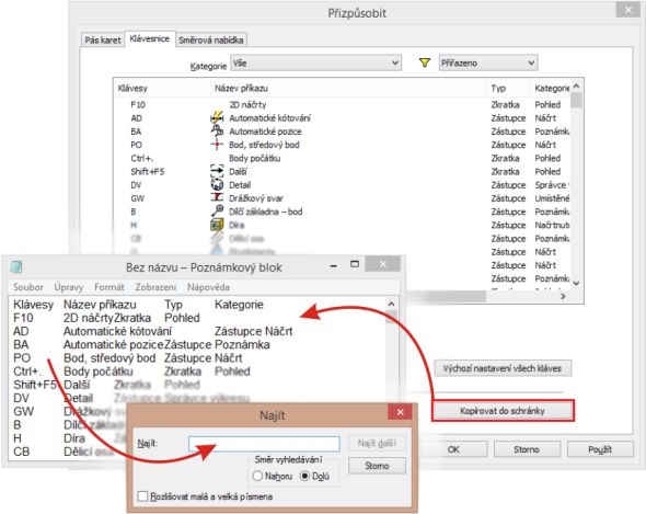 Funkce Kopírovat do schránky (6) dokáže získat seznam všech, nebo jen vybraných příkazů (záleží na vybrané kategorii).