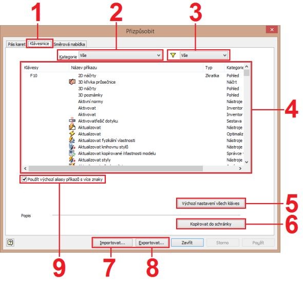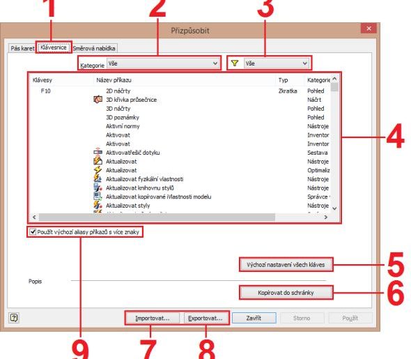Tip: Buďte pozorní při změně již použitých klávesových zkratek. Vyvarujete se tak vzniku komplikací při ovládání Inventoru.