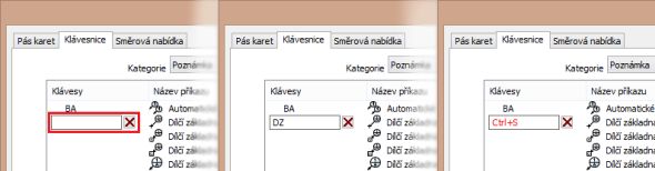 Kliknutím do příslušného pole a stisknutím klávesy nebo klávesové zkratky dojde k vyplnění pole. Zadáte-li klávesovou zkratku, která je již přiřazena, budete vyzváni k potvrzení změny. Nechcete-li změnu potvrdit, vraťte původní nastavení.