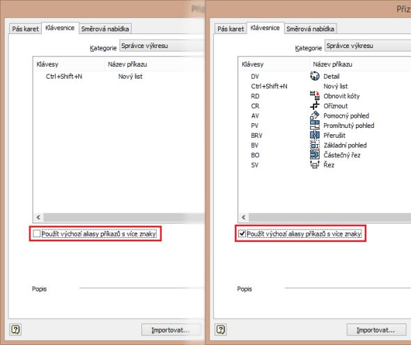 Zatrhnutí Použít výchozí aliasy příkazů s více znaky (9) umožňuje použít vícepísmenné klávesové zkratky. Bez zatržení této funkce jsou k dispozici pouze jednopísmenné klávesové zkratky, případně klávesové zkratky založené na funkční klávese (Alt, Ctrl a Shift) a písmenu.