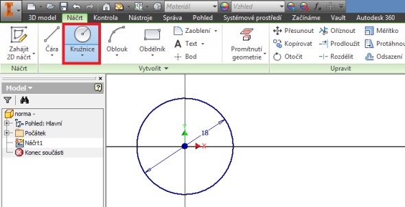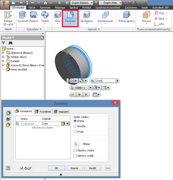 Vytvořte kružnici o průměru 18 mm. Průměr představuje opsanou kružnici vrcholů polygonu tvořícího hlavu šroubuProfil kružnice vysuňte příkazem Vysunutí do vzdálenosti 8 mm → výška hlavy šroubuFunkcí Zaoblení zaoblete horní hranu válce. Poloměr zvolte 2 mm