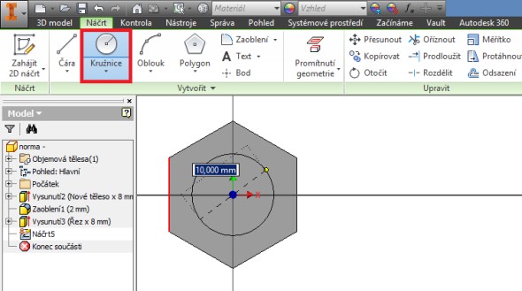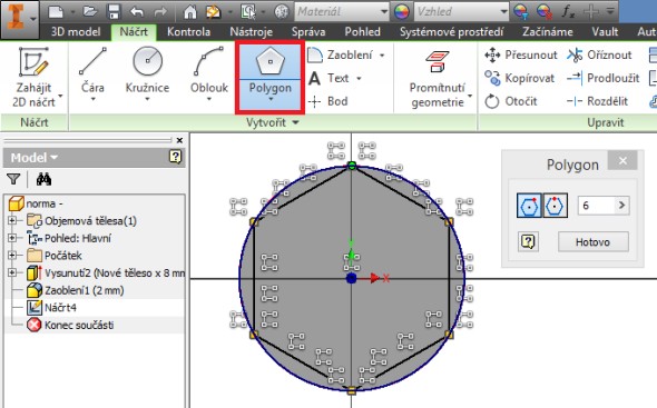 Jakmile je válec z jedné strany zaoblen, je možné vytvořit druhý náčrt, ve kterém bude nakreslen polygon. Funkci Polygon naleznete v záložce Náčrt, části Vytvořit.