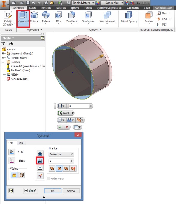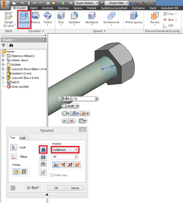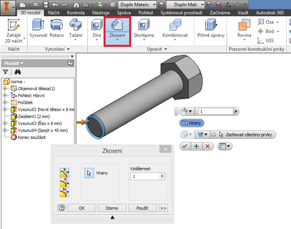 Aktivujte funkci Vysunutí a vyberte Booleovskou operaci Rozdíl. Odeberte polygon do vzdálenosti 8 mmNa hlavu šroubu navazuje dřík. Nakreslete do středu spodní strany hlavy šrouby kružnici o průměru závitu šroubu → 10 mmVysuňte profil kružnice do potřebné vzdálenosti 45 mmVyberte funkci Zkosení, která naleznete v záložce 3D model, v části Upravit. Nastavte parametry zkosení 1 × 45 stupňů, označte hrany válcové plochy a dokončete příkaz