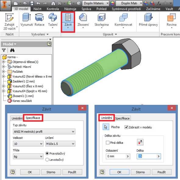 Na závěr doplňte kosmetický závit. Funkci Závit najdete v záložce 3D model, v části Upravit. Vyberte plochu, na kterou má být závit použit, a zadejte potřebné parametry (záložka Specifikace), včetně délky závitu (záložka Umístění) → M 10 × 1,25, délka závitu 25 mm