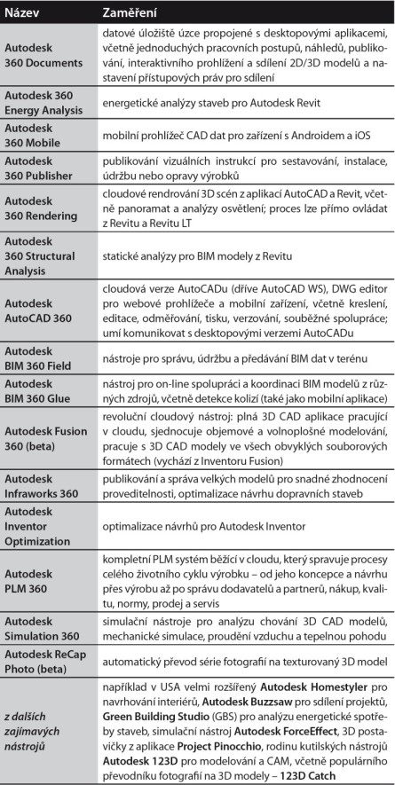 Cloudové aplikace Autodesku, z nichž některé se zrodily už před pěti lety, jsou cíleny do oblastí strojírenství, stavebnictví, infrastruktury a PLM. Protože jsou integrovány do pracovních postupů desktopových aplikací, rozšiřují jejich funkční i komunikační možnosti. Pro přístup k těmto službám přitom stačí přihlášení přes individuální účet „Autodesk ID“, který lze zdarma vytvořit a propojit s předplatným (angl. Subscription).