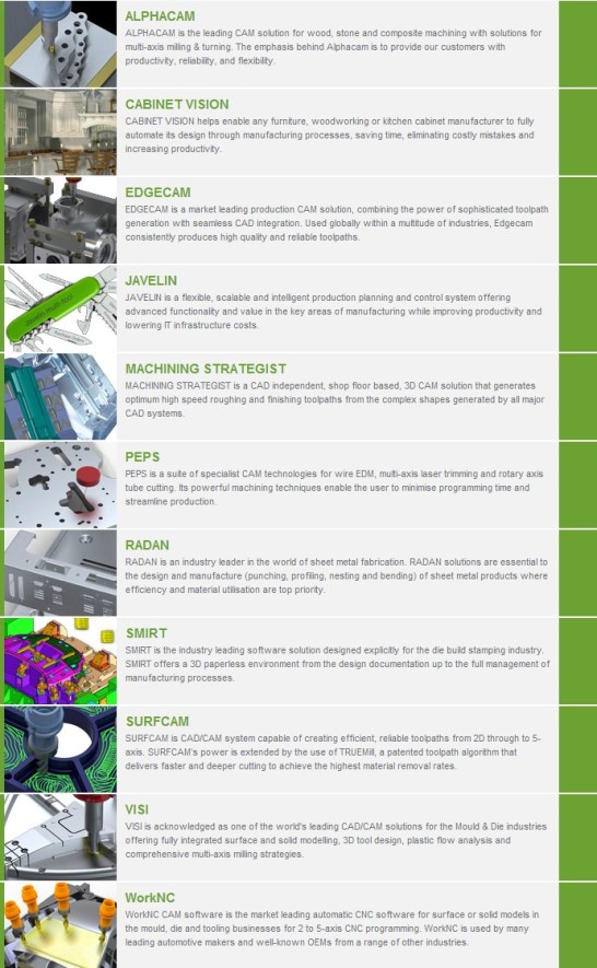 CAM software stál dlouhé roky stranou zájmu velkých dodavatelů CAx systémů, kteří se věnovali zejména nástrojům pro navrhování a design, zatímco vedle nich vznikalo množství firem i firmiček, nabízejících nejrůznější aplikace pro obrábění. Ty se v posledních letech stávají čím dál častěji předmětem akvizic, jež jednotlivé značky spojují ve více či méně rozsáhlých rodinách.
