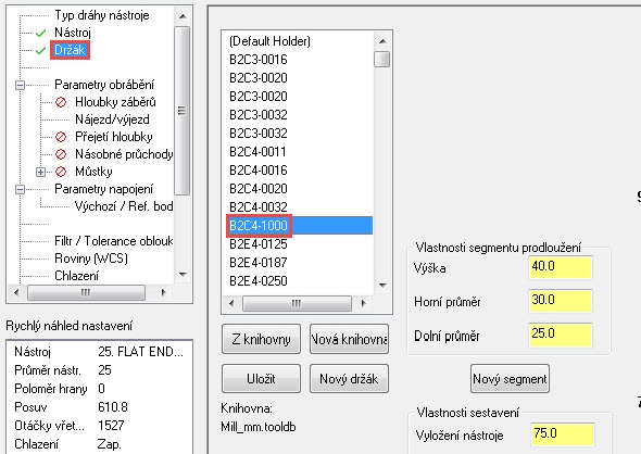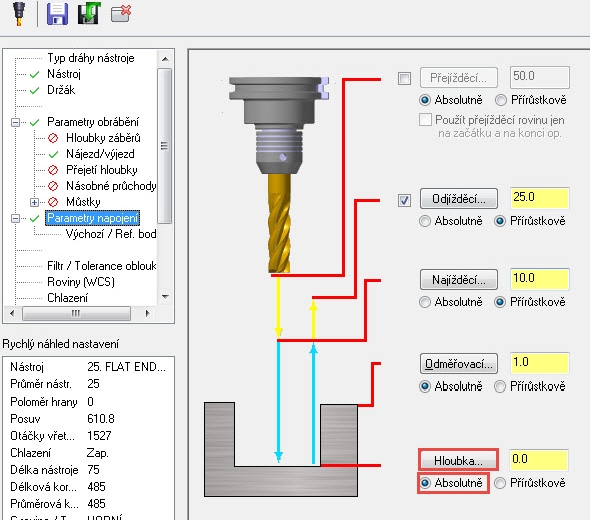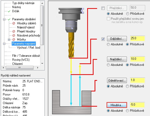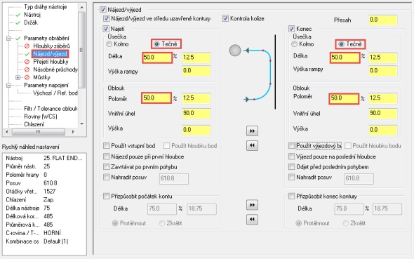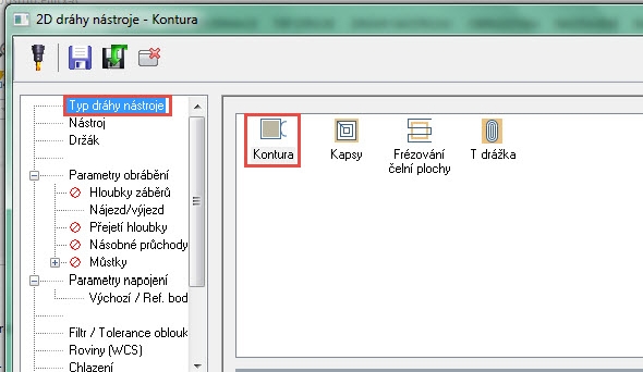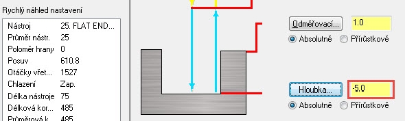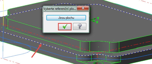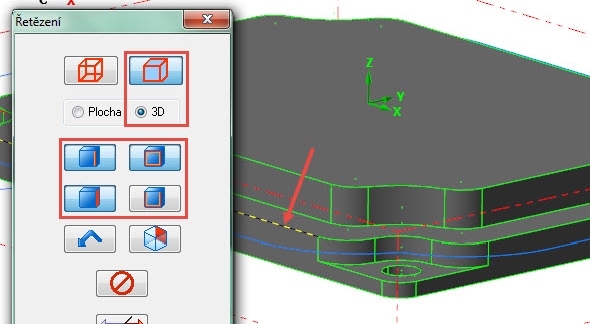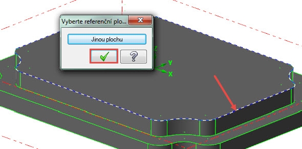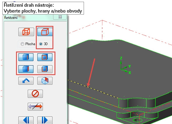 Postup programování je podobný, jako u hrubování kontury první vrstvy. Lišit se bude pouze výběrem jiných hran řetězení.