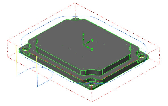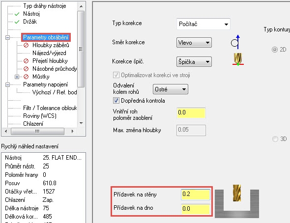 Provedeme programování drah nástroje pro obrobení první vrstvy kontury modelu hrubováním. Velikost nástroje zvolíme tak, aby odebral i přesahující části polotovaru. Přídavek na dokončení 0,2 mm ponecháme pouze na stěnách