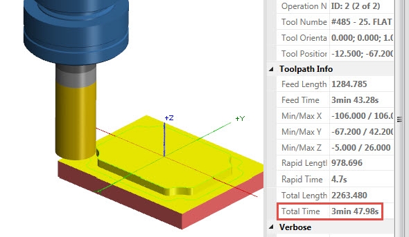 Vyberte příkaz Kontura ze záložky Dráhy nástrojůProveďte výběr kontury druhé vrstvy označením přechodové hranyUpřesněte výběr plochy prostřednictvím tlačítka Jinou plochu Změňte výběr hranyV okně 2D dráhy nástroje – Kontura ponechejte všechna nastavení, výběr nástroje a držáku beze změn a přejděte do záložky Parametry napojení. Tlačítkem Hloubka definujeme novou hloubku v absolutních hodnotáchOznačte koncový bod hranyZměněná hloubka obráběníVygenerovaná trajektorie nástroje hrubování kontury druhé vrstvyOvěříte-li všechny dráhy nástrojů, můžete sledovat teoretický čas obrábění