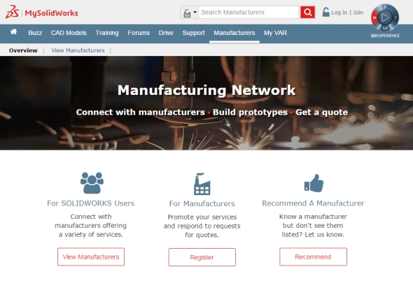 - MySolidWorks Manufacturing Network propojuje uživatele se spolehlivými výrobci, kteří se zaměřují na 3D tisk, výrobu plechových součástí, CNC obrábění nebo vstřikování plastů. Tito výrobci mohou požádat o registraci a uživatelé zase mohou navrhnout výrobce, kteří by do ní měli být zahrnuti.