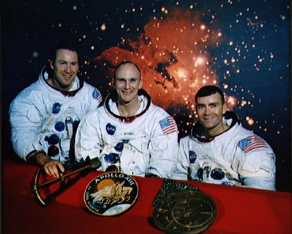 Původní posádka lodi Apollo 13. Zleva kapitán James A. Lovell, pilot velitelského modulu