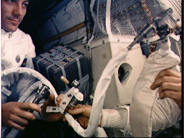Astronauti na palubě Apolla 13 sestavují improvizovanou