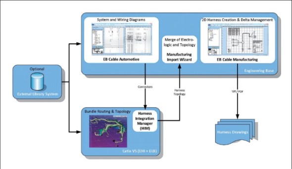 Catia V5 s pomocí rozhraní HIM získá od EB Cable základní rozměry elektrických komponentů. V prostoru nově namodelované údaje z 3D návrhu kabelového svazku v systému Catia pak HIM zpětně převede do EB Cable. Takto zachází například s informacemi o topologii, délce, ochranném materiálu atd. Zde pak dochází k finálnímu sestavení komplexního svazku vodičů včetně automatické tvorby příslušné 2D výrobní a montážní dokumentace.