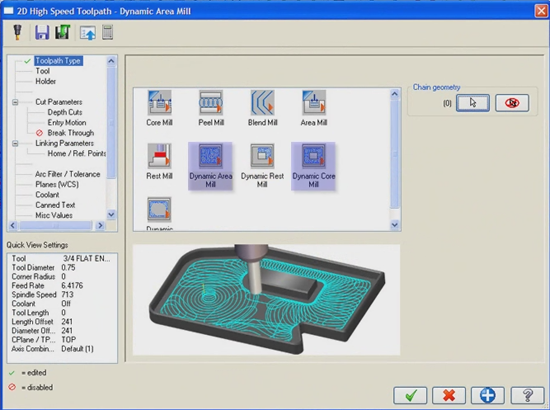 Jelikož si při zadávání operací dynamického frézování někteří uživatelé Mastercamu X4 stěžovali na nutnost zvláštního nastavení dráhy nástroje, byla tato v nové verzi rozdělena na dvě samostatné volby. Dráhu „Dynamic Area Mill“ využijete při frézování kapes v ploše, varianta „Dynamic Core Mill“ potom slouží k frézování ve směru od hrany obrobku.