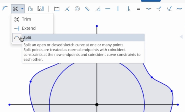 Nástroje pro skicování nabízí funkci Split, která rozdělí entity v místě kliknutí myši. To je vhodné zejména v případech, pokud chcete vybrat pouze část uzavřeného náčrtu. Funkce Split se skrývá pod tlačítkem Trim.