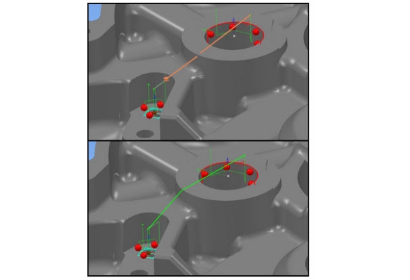 Automatizovaný přejezd sondy bez kolize urychlí čas programování. Nová funkce znázorněna na obrázku dole. Zdroj: Delcam