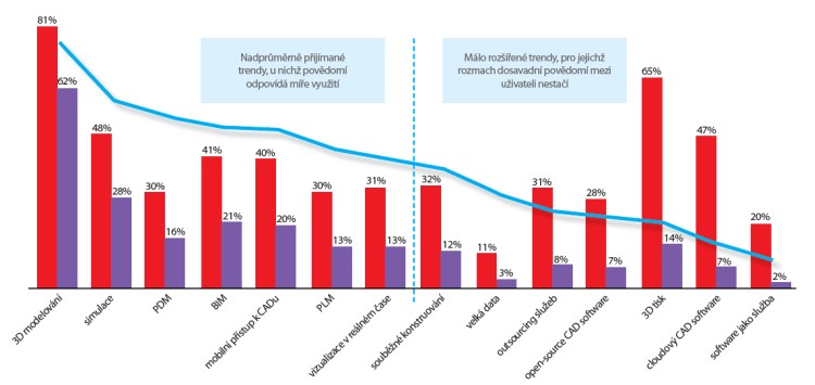Autoři studie vytipovali čtrnáct trendu v přímé souvislosti s CAD softwarem a u každého měřili tři faktory – jaké je mezi koncovými uživateli o takové záležitosti povědomí, zda ji z hlediska svojí činnosti vnímají jako užitečnou, respektive podstatnou a nakonec, jestli už danou technologii používají anebo to alespoň v blízké době plánují.