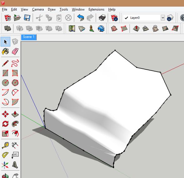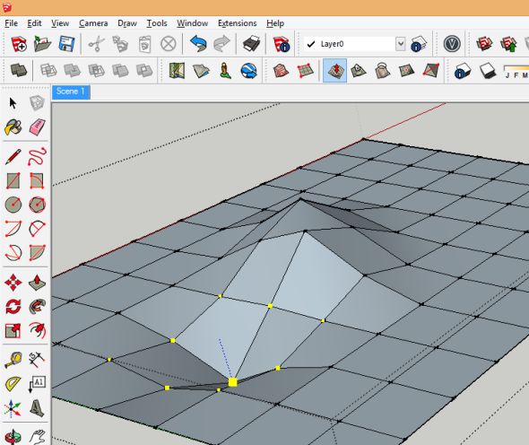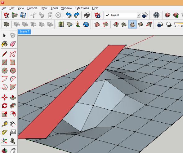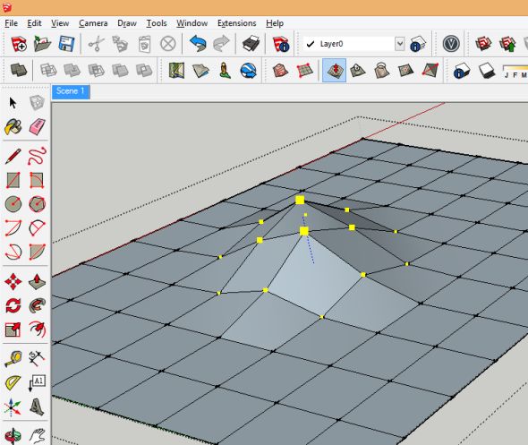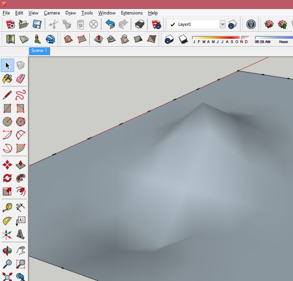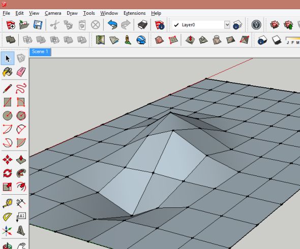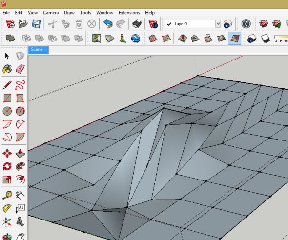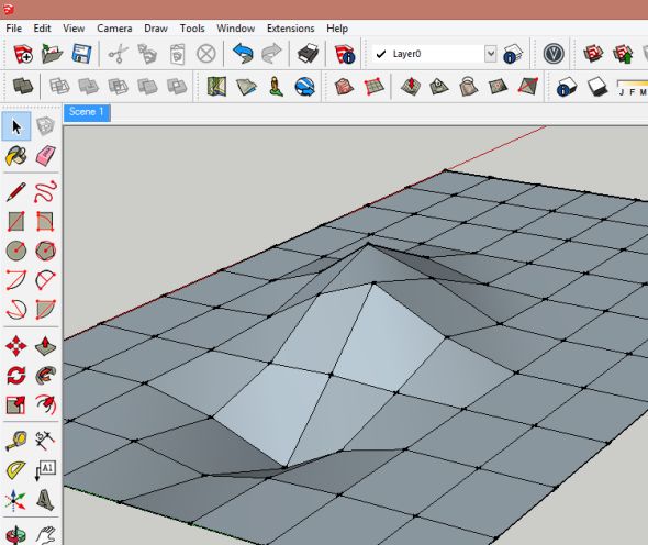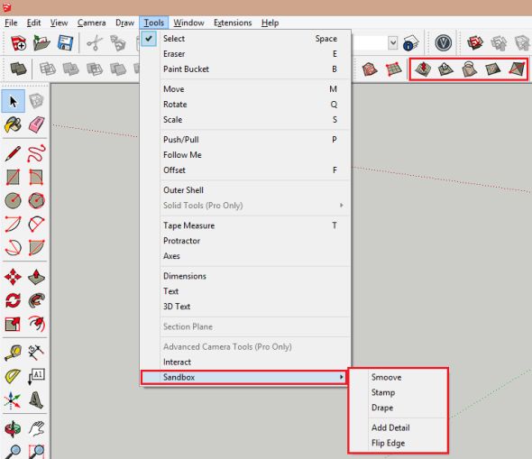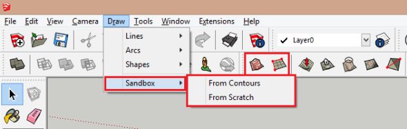 Pro modelování terénu z kontur, čar a křivek se používají funkce Sandbox. Nástroje jsou k dispozici v záložce Draw → Sandbox, případně přímo v panelu nástrojů.