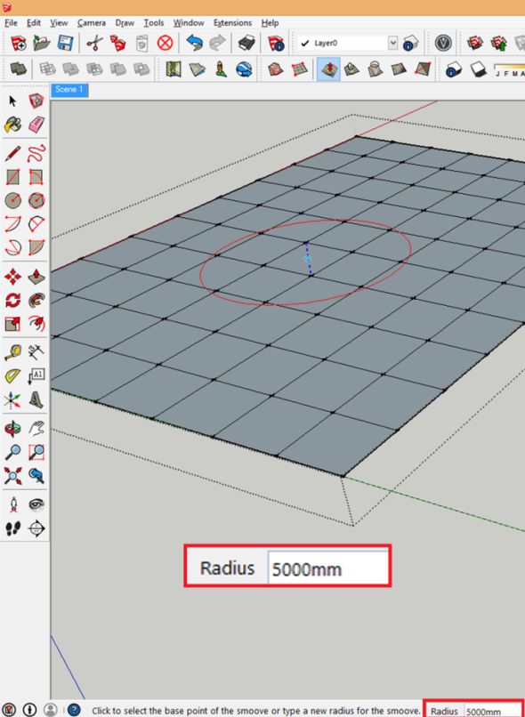 Funkce Smoove umožňuje na libovolném průměru (poloměru) vytažení sítě terénu nahoru („na kopec“) nebo dolů („do údolí“). Užití funkce Smoove popisují následující obrázky.