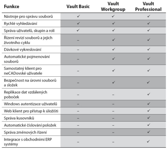 Vault dnes existuje ve třech variantách – Vault Basic, Vault Workgroup a Vault Professional. Vedle zmíněné bezplatné verze Vault Basic tak existují i vyšší varianty Vaultu, které nabízejí podstatně rozšířenou funkcionalitu (viz tabulka).