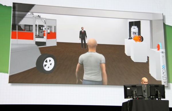 Virtuální Jeremy Luchini kráčí ke svému nadřízenému, aby mu ukázal, co vše umí jeho návrh závěsného křesla. Ve skutečnosti přitom stojí za svým počítačem (vpravo dole) a ovládá svého avatara.