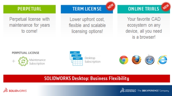 Dlouhodobé spekulace o přechodu do cloudu se letos potvrdily. Bylo možné je vycítit již na loňské konferenci ve Phoenixu, kde byl představen nový vizuální styl. Jelikož chce společnost SolidWorks vyhovět budoucím i stávajícím zákazníkům, uvedla nové možnosti licencování. Novinkou je předplatné SolidWorksu omezené dobou – na čtvrt roku nebo déle. Výhodou jsou nižší náklady, flexibilita, škálovatelné možnosti licencování a výběr zahrnovaných modulů. SolidWorks bude dostupný i on-line a vše, co budete potřebovat ke spuštění, je internetový prohlížeč. SolidWorks On-line Trials se momentálně testuje a v blízké době bude rozšířen o 14 jazykových mutací. Tradiční trvalé licence s roční aktualizací a placenou podporou zůstávají i nadále.