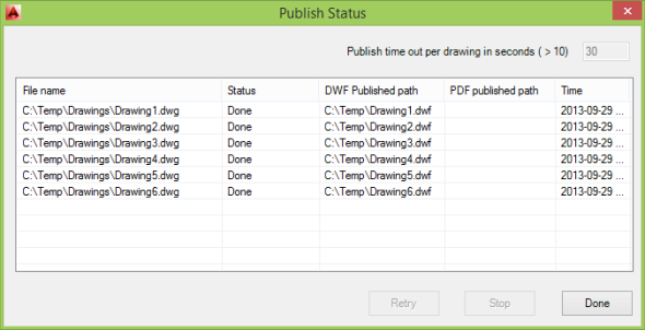 Pokud během procesu exportování dojde k chybě, AutoCAD se restartuje a po opětovném spuštění pokračuje dávková produkce výkresů od místa, kde došlo k chybě. Další praktickou vlastností této aplikace je možnost publikovat v sadě pouze ty výkresy, které byly od posledního exportu nějakým způsobem změněny.