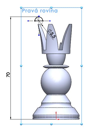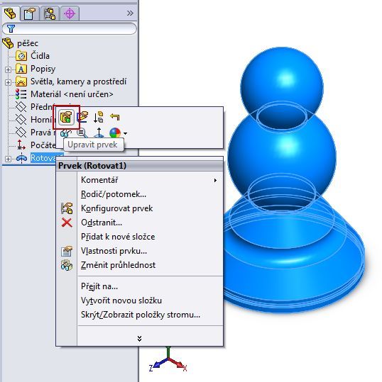 Otevřete model pěšce a uložte jej jako nový dokument s názvem dáma.sldprt. Klikněte pravým tlačítkem ve stromové struktuře na vytvořenou operaci Rotovat a klikněte na příkaz Upravit prvek.