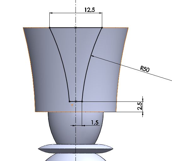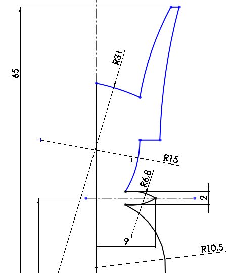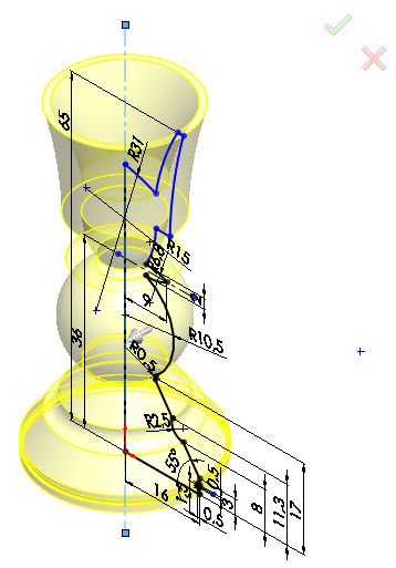 Změňte horní část skici dle obrázku. Dbejte na tečnou závislost mezi oblouky.