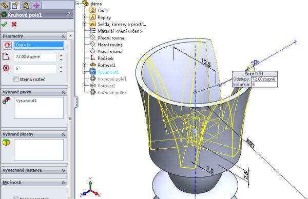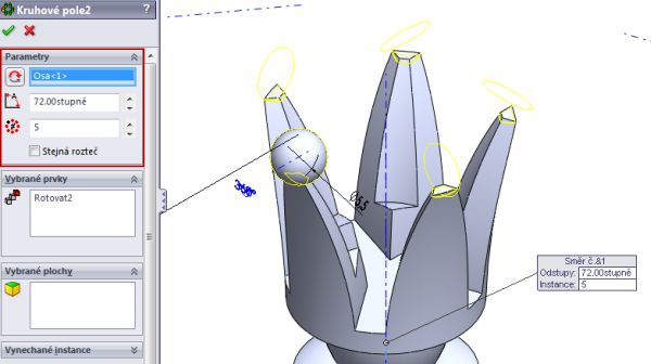 Příkaze kruhové pole okopírujte odebrání kolem rotační osy součásti. Zviditelníte ji příkazem Zobrazit pomocné osy.