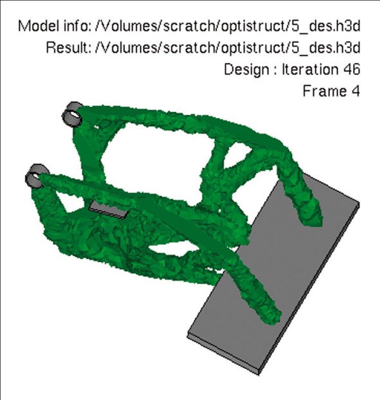 Ideální tvar součásti byl nalezen po 46 iteracích. Během každé iterace optimalizační program odebíral materiál z nejméně namáhaných míst a následně proběhl MKP výpočet namáhání součásti. Finální tvar byl převeden do prostředí CAD softwaru a následně zadán do výroby na stroji M2 Cusing od firmy Concept Laser.