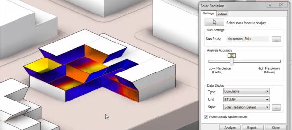 Velmi prakticky se jeví funkce pro okamžitou analýzu oslunění a zastínění, která vypočítá realistickou situaci dle ročního období, denní doby a geografické lokace, jež se definuje na integrované mapě světa od Google. Tvůrce projektu díky tomu může navrhovaná tělesa ihned optimalizovat s ohledem na denní světlo, množství solární radiace apod., přičemž takto dokáže porovnávat rozdílné varianty návrhu a rozhodovat se pro tu nejlepší. Energetické analýzy je možné zobrazit v podobě tabulek nebo názorných grafů.