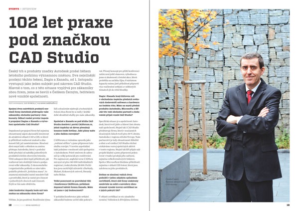 Ve velkém rozhovoru jsme vyzpovídali Čeňka Černého, ředitele nové společnosti CAD Studio, která vznikla počátkem listopadu sloučením firmy Dagis a CAD divize firmy Xanadu. Jaké dopady bude mít tato změna na zákazníky obou podniků, jakou budoucnost čeká web CADforum.cz a stejnojmennou uživatelskou konferenci? To a mnohé další zodpoví naše interview.