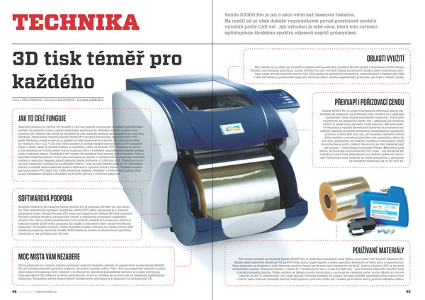 V technické sekci jsme se zaměřili na technologie rychlé výroby prototypů, konkrétně 3D tisk. Dopodrobna pitváme kancelářskou 3D tiskárnu Solido SD300 Pro, která je bezkonkurenční svojí cenou pod sto tisíc korun. O pokročilejších metodách aditivní tvorby prototypů se rozepisuje Miloslav Drápela ze společnosti MCAE Systems, jež na českém trhu již spoustu let patří k předním propagátorům 3D tisku.