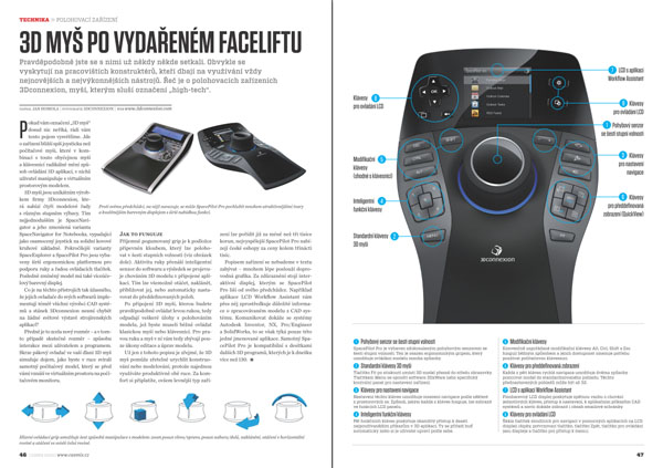 V hardwarové rubrice jsme si posvítili na polohovací zařízení SpacePilot Pro od 3Dconnexion. Ukážeme vám, k čemu je tato exotická 3D myš dobrá a také, jak se vlastně ovládá. Navíc můžete jeden kus SpacePilot Pro vyhrát v naší soutěži, která probíhá od 1. do 31. prosince. Velmi zajímavou novinkou je i velkoformátové multifunkční zařízení HP Designjet T2300 eMFP. Proč? Dokáže například vytisknout CAD výkres bez toho, abyste na svém počítači museli mít nainstalován CAD systém, jakýkoliv prohlížeč CAD souborů nebo dokonce ovladače této tiskárny. Je totiž zcela soběstačná.