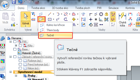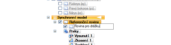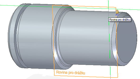 Otevřete uložený soubor čep, vymodelovaný podle jednoho z návodů. Pro odebrání drážky pro pero je nutné vytvořit tečnou rovinu k požadované ploše tělesa. Vyberte příkaz Tečně ze záložky Domů → RovinyKlikněte na válcovou plochu čepu, kde bude odebrána drážka. Tahem myši nebo zadáním na numerické klávesnici určete, kde má rovina vzniknout. V tomto případě zadejte 360 a rovina se vytvoří v pohledu NárysPro lepší přehlednost si rovinu přejmenujte Rovina pro drážku. Změnu provedete najetím kurzoru do stromového modelu, výběrem nové roviny a stisknutím klávesy F2Přejmenování roviny se promítne i do grafické plochy. Vyberte příkaz Obdélník dvěma body ze záložky Domů → Kreslit, poté najeďte na Rovinuprodrážku a uzamkněte ji (klávesa F3)Nakreslete obdélník na požadované ploše, popřípadě obdélník přesuňte nebo zavazběte na střed osy rotačního tělesa