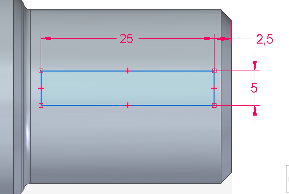 Nakreslený obdélník příkazem Chytrákóta a zakótujte délku 25 mm, šířku 5 mm a odsazení od pravé hrany čepu 5 mmV dalším kroku nakreslete dvě kružnice do připraveného obdélníku, které budou vymezovat boky drážky. Pro tento krok použijte příkaz Kružnicestředem ze záložky Domů → KreslitNakreslete vepsané kružnice o průměru 5 mm kamkoliv do obdélníku