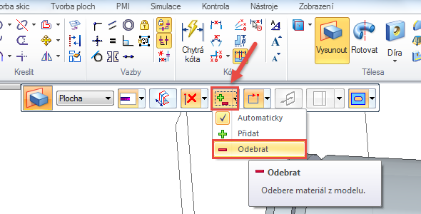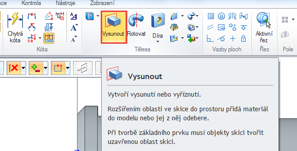 Vyberte příkaz Tečně ze záložky Domů → Vazby. Poté klikněte na kružnici a svislou čáru obdélníku. Postup opakujte i pro druhou stranu drážkyPříkazem Oříznout ze záložky Domů → Kreslit ořízněte přebývající části drážkyHotová skica je připravena pro odebrání drážky pro peroNyní máme připravenou skicu pro funkci Vyříznutílineární. Vyberte příkaz Vysunout ze záložky Domů → TělesaKliknutím vyberte naskicovanou drážku a v plovoucím okně nabídky Vysunout zvolte Odebrat. Poté tahem kurzoru myši nastavte vzdálenost vyříznutí, nebo zadejte přesnou hodnotu na numerické klávesnici. Potvrďte klávesou Enter.Odebraná drážka pro pero