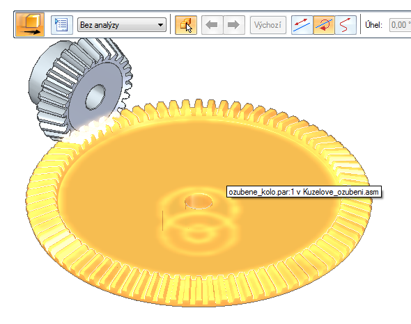 Pohyb sestavy si ukážeme na kuželovém soukolí. Kinematický vztah součástí bude zajišťovat stisknuté tlačítko a tah směrem dopředu nebo dozadu. Nejedná se však o animaci, funkce přetáhnout komponentu slouží jen pro ukázku pohybu sestavy v reálném čase.