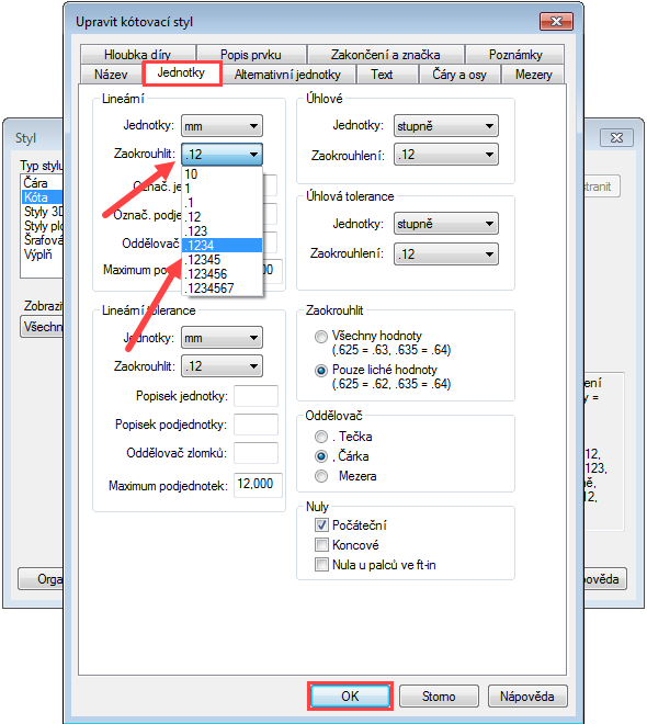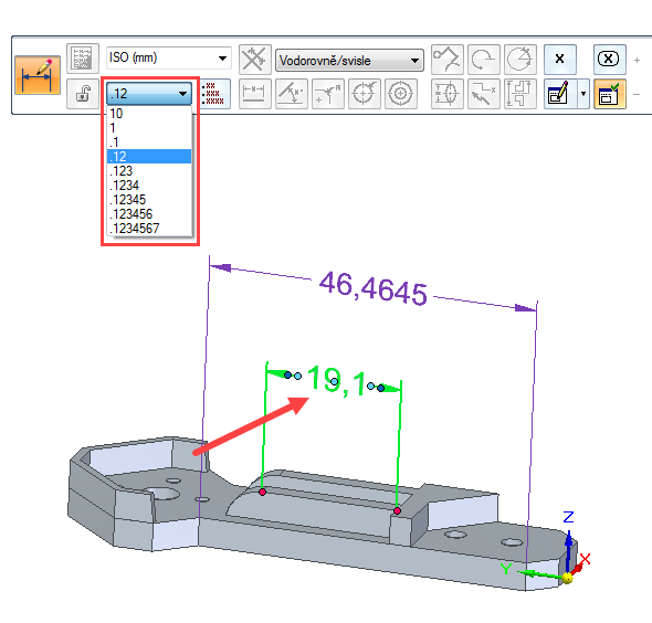 Založte nový dokument iso metric part.par nebo otevřete již existující dokumentZe záložky PMI → Kóta vyberte funkci StylyV otevřeném okně stylů můžete upravovat také styl čáry, 3D pohledu, šrafování atd. Zvolte typ stylu Kóta a ISO (mm) → tento styl budeme upravovat. Klikněte na Upravit… nebo můžete založit úplně nový stylParametrů je mnoho a každá záložka obsahuje nastavení jiné funkce. Vyzkoušejte si změnit počet míst pro zaokrouhlení ze standardně nastavených dvou míst na čtyři dle obrázku. Potvrďte tlačítkem OKZměna se projeví ihned na všech kótách modeluTip: Pokud nechcete mít na všech kótách stejné zaokrouhlení, stačí kliknout levým tlačítkem na kótu, kterou chcete editovat a v plovoucím okně změnit počet míst zaokrouhlení