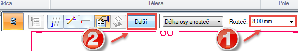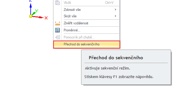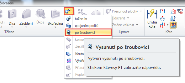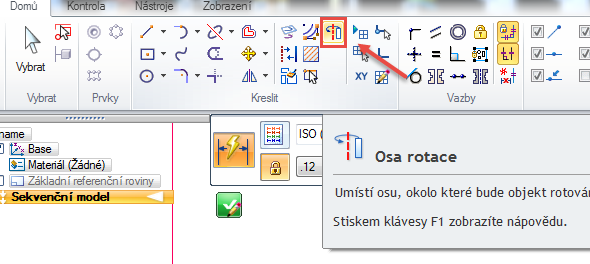 Založte nový dokument iso metric part.par a pravým tlačítkem myši otevřete nabídku, kde vyberte příkaz Přechod do sekvenčníhoTím jste změnili prostředí synchronního modelování na sekvenční. Všimněte si, jak se změnilo prostředí se záložkamiZvolte funkci Vysunutí po šroubovici ze záložky Domů → TělesaKlikněte na základnu (ZX), tím si definujete rovinu pro skicování……a automaticky se zvolí příkaz čára. Nakreslete vodorovnou čáru do prostoruZvolte příkaz Připojit ze záložky Domů → VazbyKlikněte na nakreslenou čáru a poté označte na osu X. Tím se připojí nakreslená čára na osuPříkazem Chytrá kóta ze záložky Domů → Kóty definujte vzdálenost čáry k ose Z na 30 mmZakótujte celkovou délku čáry 60 mmZvolte funkci Kružnicestředem ze záložky Domů → KreslitKružnici nakreslete pod jedním koncem čáry (využijte automatické uchopování) a vystřeďte jiV dalším kroku kružnice zakótujte podle obrázkuNakreslenou čáru musíme nejprve převést na Osu, podle které bude pružina rotovat. Ze záložky Domů → Kreslit zvolte funkci OsarotacePouhým kliknutím na čáru se převede na osuSkica je připravená pro konstrukci pružiny. Skicu ukončete potvrzovacím tlačítkem vpravo nahoře v liště ze záložky Domů → ZavřítJakmile zavřete skicu, klikněte myší na vytvořenou osu a v plovoucím okně zadejte rozteč 8 mm (1.) a klikněte na tlačítko Další (2.)Tlačítkem Náhled zobrazte objemové těleso